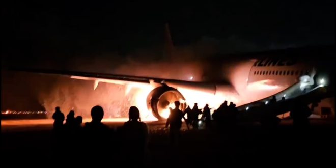 وأظهرت اللقطات طائرة الركاب تتحرك ثم تشتعل فيها كرة نارية كبيرة.