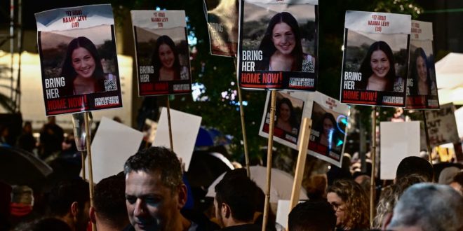 تجمع آلاف الأشخاص في مسيرة في تل أبيب، السبت، نظمها منتدى أسر الرهائن والمفقودين، للمطالبة بالإفراج عن الرهائن المحتجزين لدى حركة حماس في غ-ز-ة.