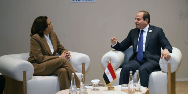 بحث الرئيس المصري، عبدالفتاح السيسي، السبت، خلال استقباله في دبي، كامالا هاريس نائب الرئيس الأمريكي جو بايدن، العلاقات بين مصر والولايات المتحدة والحرب في غ زة، وأكد الجانبان رفض بلديهما التهجير القسري للفلسطينيين.