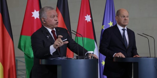 وقال الملك عبدالله الثاني في مؤتمر صحفي مشترك مع المستشار الألماني أولاف شولتس عقب لقائهما في برلين، الثلاثاء، إن “ذلك توجه من عدد من الجهات لخلق واقع جديد على الأرض”