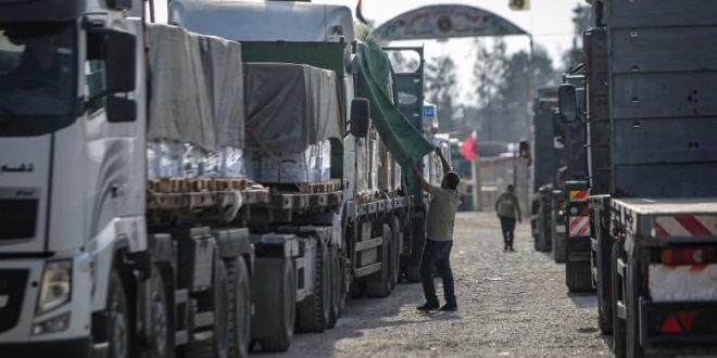 وتصطف قافلة كبيرة من شاحنات المساعدات عند معبر رفح الحدودي على الحدود بين مصر وغ-زة، على أهبة الاستعداد عندما تبدأ الهدنة بين إسرائيل وحركة “ح-م-اس”، وعلى الرغم من أن المكتب الصحفي للحكومة المصرية قال ، فإنه لم يتضح بعد نوع المساعدات أو حجم المساعدات التي سيتم السماح بدخولها إلى قطاع غ-زة.