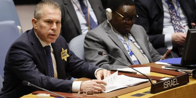 وارتدى السفير الإسرائيلي لدى الأمم المتحدة، جلعاد إردان، النجمة الصفراء، التي ترمز إلى معتنقي الدين اليهودي الذين أُجبروا على ارتدائها في دول أوروبا التي احتلها النازيون خلال الهولوكوست، الإثنين، احتجاجاً على استمرار قرار مجلس الأمن التابع للأمم المتحدة بعدم إدانة حماس لهجومها في 7 أكتوبر/تشرين أول.