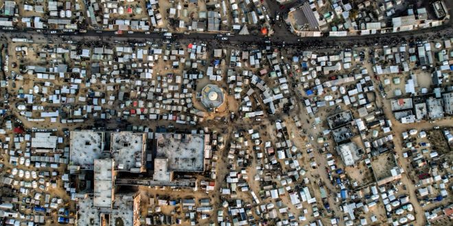 يُظهر هذا المنظر الجوي مخيمات النازحين الفلسطينيين في رفح بجنوب قطاع غزة بالقرب من الحدود مع مصر في 31 ديسمبر/ كانون الأول