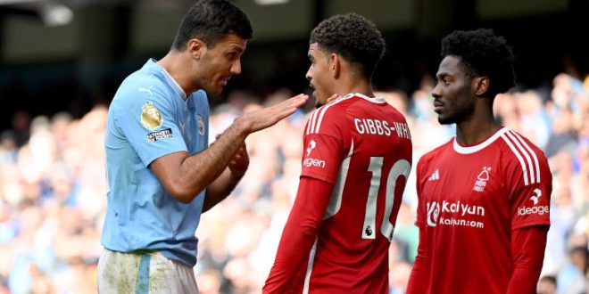 نشب شجار بين رودري، لاعب نادي مانشستر سيتي، ولاعب نادي نوتينغهام فورست، مورغان جيبس وايت، خلال مواجهة الفريقين على أرض استاد الاتحاد، ضمن منافسات الدوري الإنجليزي الممتاز (البريميرليغ).
