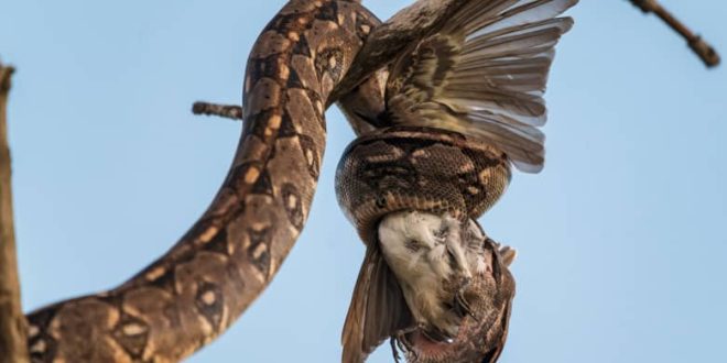 وفي مشهد مؤلم، رصد مصور الحياة البرية، ميغيل بيريز، لحظة عناق لا تُشبه غيرها، إذ أنها لأفعى تعتصر طائرًا مهاجرا، ثم تبتلعه كاملا في النهاية.