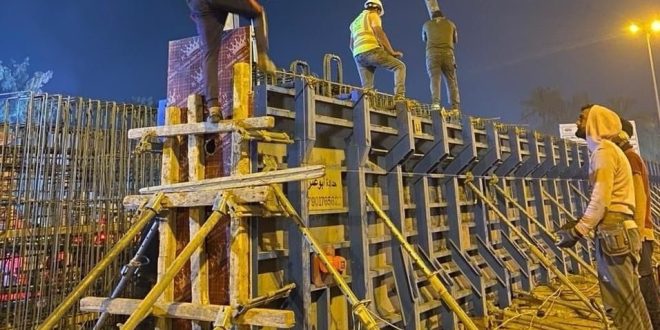 وتم الانتهاء من أعمال وضع الروافد واستمرار أعمال صب الفضاءات، حيث يتواصل العمل بالمشروع على مدار الساعة طيلة ايام الاسبوع.