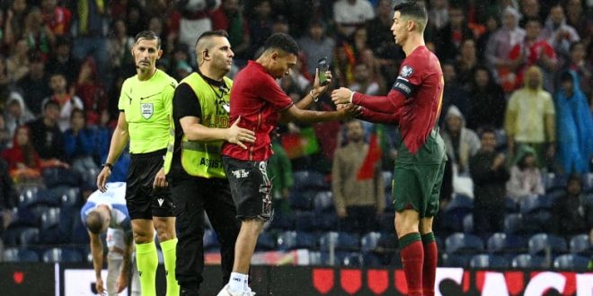 اقتحم أحد المشجعين أرض ملعب مباراة البرتغال وسلوفاكيا، الجمعة، ضمن منافسات التصفيات المؤهلة لكأس أمم أوروبا 2024، للقاء النجم البرتغالي كريستيانو رونالدو.