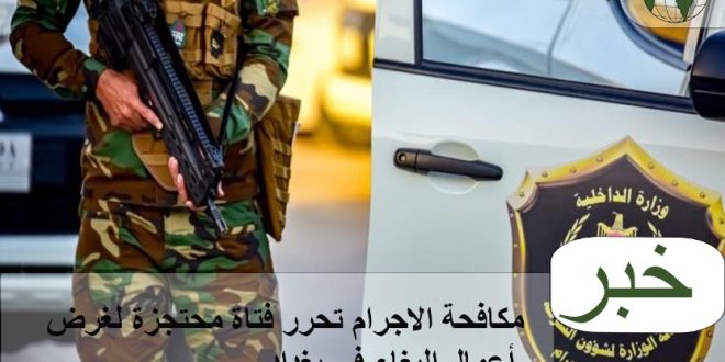 المديرية قالت في بيان تلقته وكالة الموقف العراقي ان مفارز مكافحة إجرام بغداد تمكنت من تحرير فتاة (حدث) تم احتجازها داخل إحدى الشقق السكنية من قبل امرأتين ورجل لغرض أعمال البغاء ضمن منطقة الدورة جنوب بغداد.