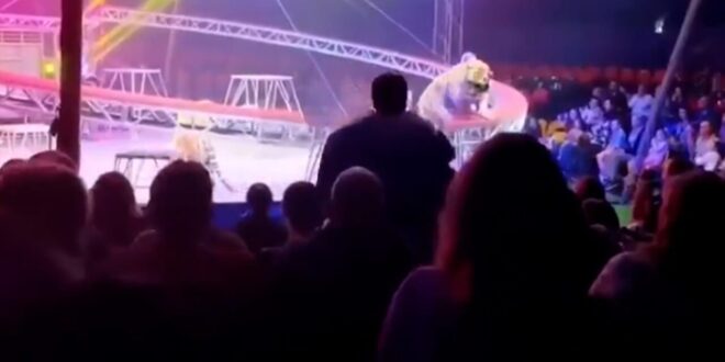 قفز نمر باتجاه الجمهور في عرض سيرك متنقل في روستوف-أون-دون، جنوب روسيا، بعد بعد سقوط شبكة الأمان أثناء العرض.