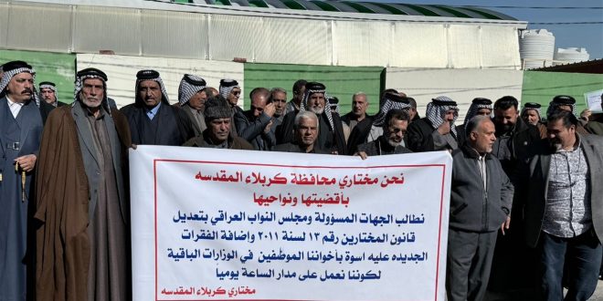 تظاهر العشرات من مختاري كربلاء المقدسة، اليوم الخميس، أمام مكتب مجلس النواب للمطالبة بتعديل قانون المختارين.