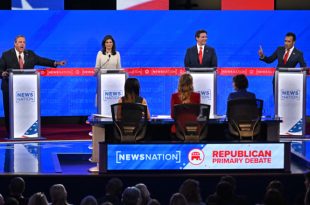 اجتمع المرشحون الأربعة (بغياب ترامب) الذين يسعون بالفوز بتمثيل الحزب الجمهوري بسباق الانتخابات الرئاسة الأمريكية 2024 في المناظرة الرابعة، الأربعاء، وفيما يلي نستعرض لكم ملخصا سريعا: – تواجه المرشحون الأربعة وهم: حاكم فلوريدا رون ديسانتيس، وحاكمة ساوث كارولينا السابقة نيكي هالي، ورجل الأعمال فيفيك راماسوامي، وحاكم نيوجيرسي السابق كريس كريستي …