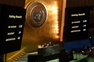 أقرت الجمعية العامة للأمم المتحدة ، بأغلبية ساحقة، مشروع قرار قدمه الأردن يدعو إلى وقف إطلاق النار بين إسرائيل و حركة “حماس”، في مواجهة اعتراض شديد من الولايات المتحدة وإسرائيل. وصوتت 120 دولة لصالح مشروع القرار مقابل 14 دولة وامتنعت 45 دولة عن التصويت، واندلع التصفيق في قاعة الجمعية عندما …
