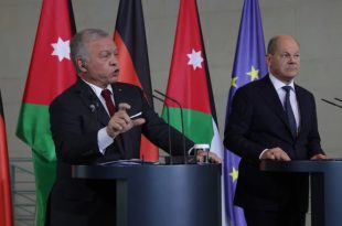 – أكد العاهل الأردني الملك عبدالله الثاني، الثلاثاء، أنه لا يمكن استقبال اللاجئين في الأردن ولا في مصر جراء القصف الإسرائيلي في غزة، مشيرا إلى أن هذا “خط أحمر”، بحسب بيان نشره الديوان الملكي الهاشمي على موقعه. وقال الملك عبدالله الثاني في مؤتمر صحفي مشترك مع المستشار الألماني أولاف شولتس …
